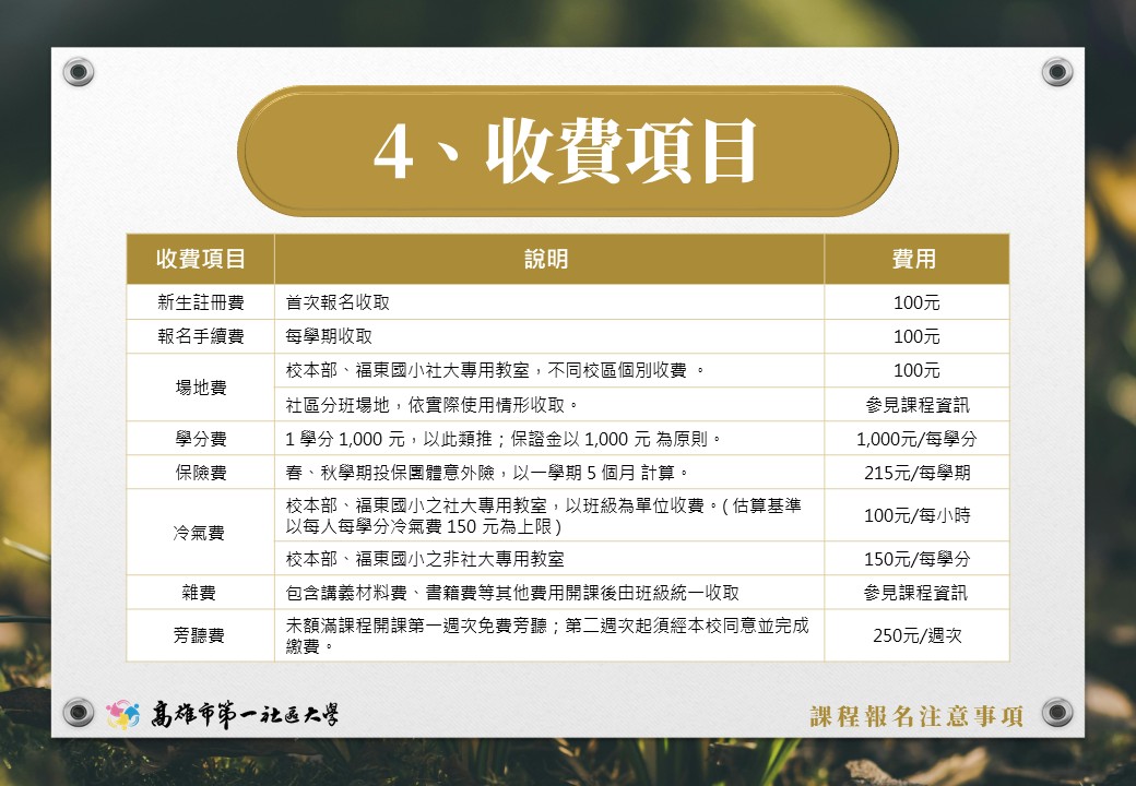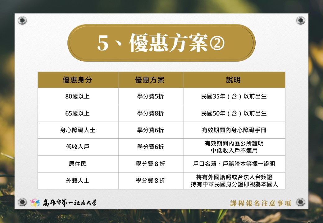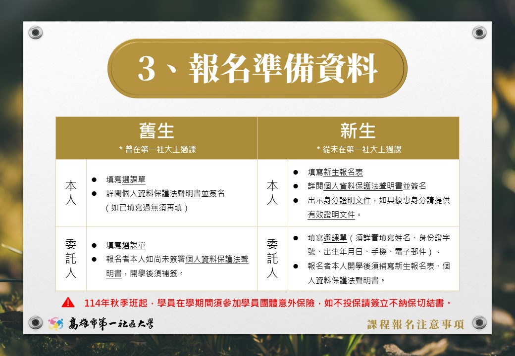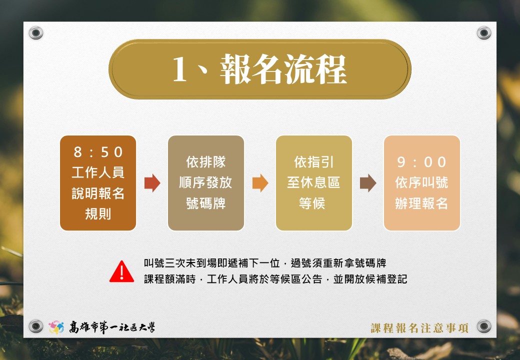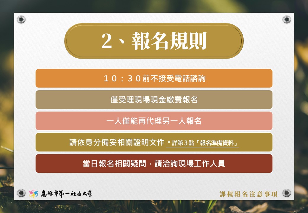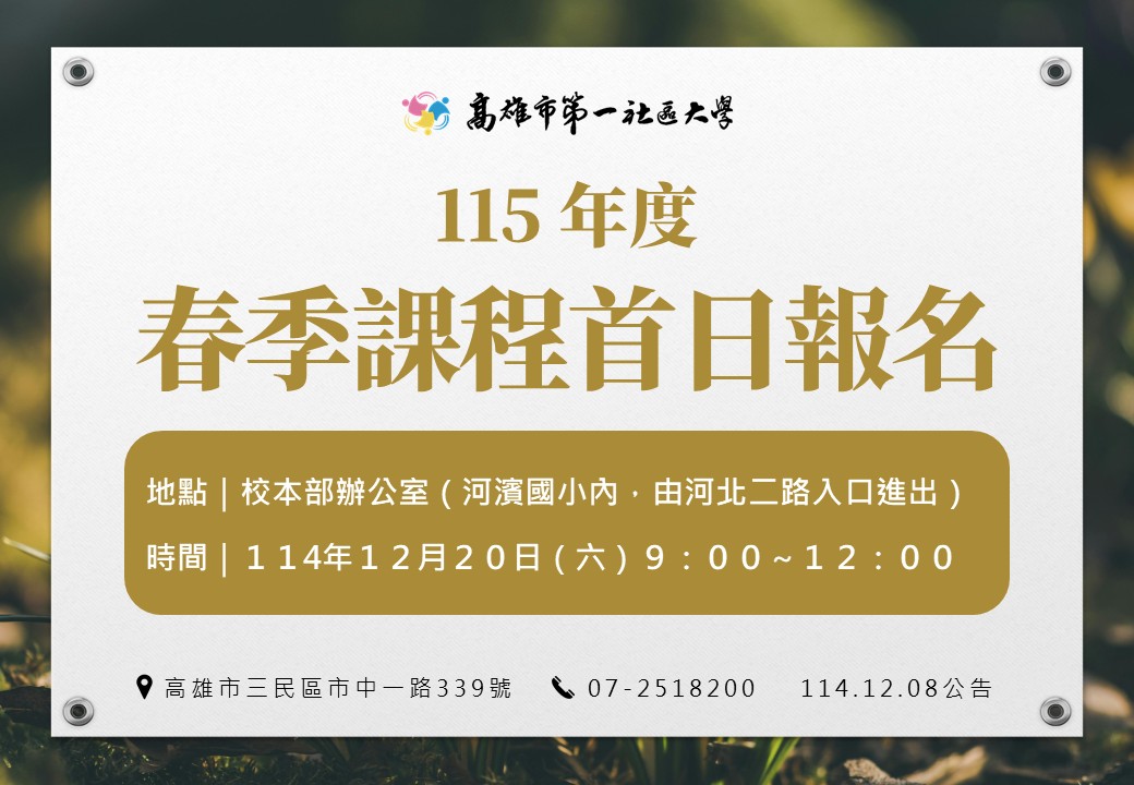 115年【春季班】首日報名規則 第一社區大學 115年春季班 數位簡章已發布, 並將於12月20日(六)進行首日報名作業, 春季課程介紹敬請詳閱官網【最新課程】訊息。 【春季報名期程】 12月20日(週六)當天為首報日作業,上午僅供現場排隊報名。 12月22日(週一)起,開放受理轉帳繳費報名。 【首日報名相關規則請見圖片說明】 課程報名諮詢|07-2518200 轉帳繳費報名|請直接來信 khcu@kcs.org.tw