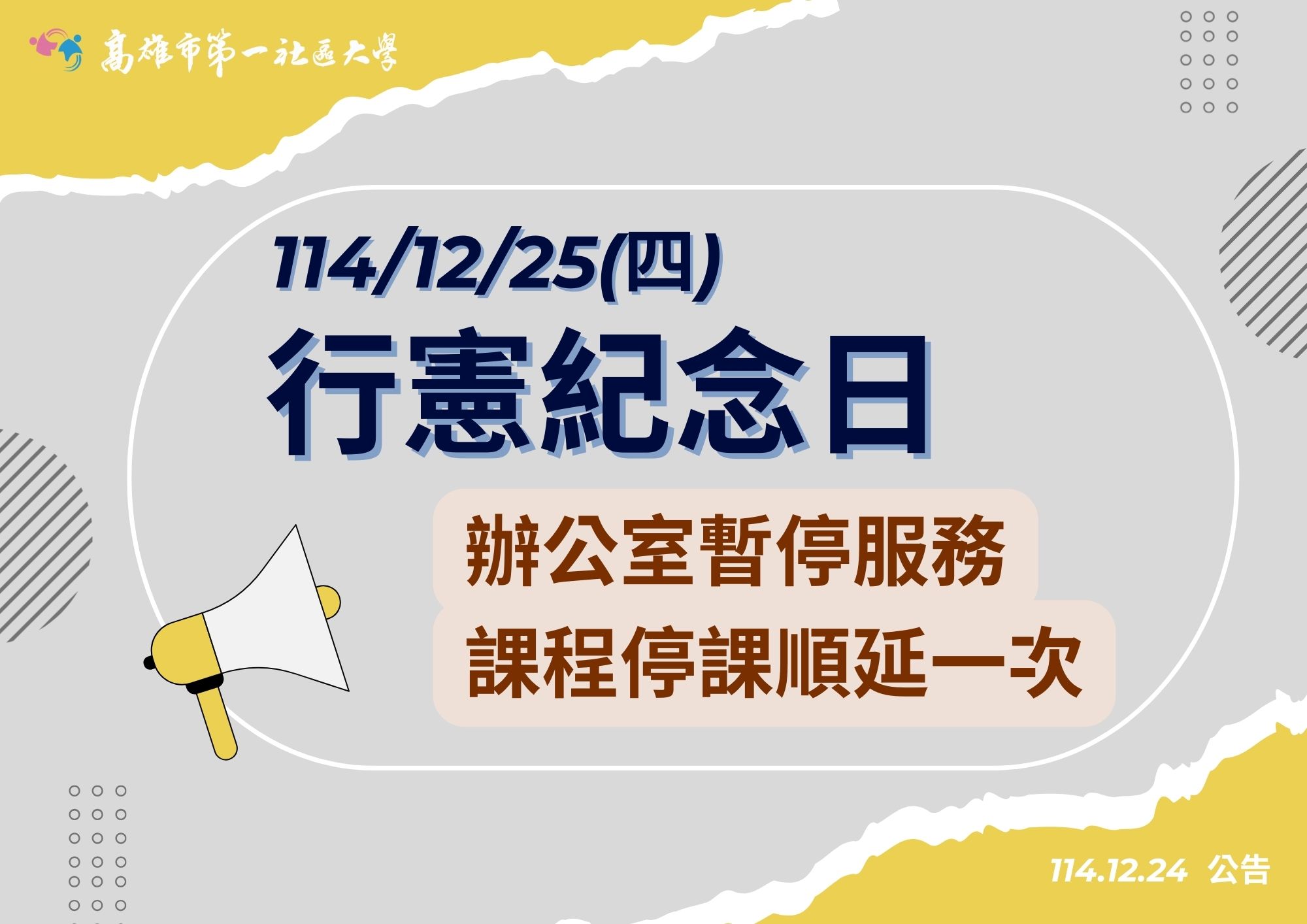 12/25(四)行憲紀念日,辦公室暫停服務